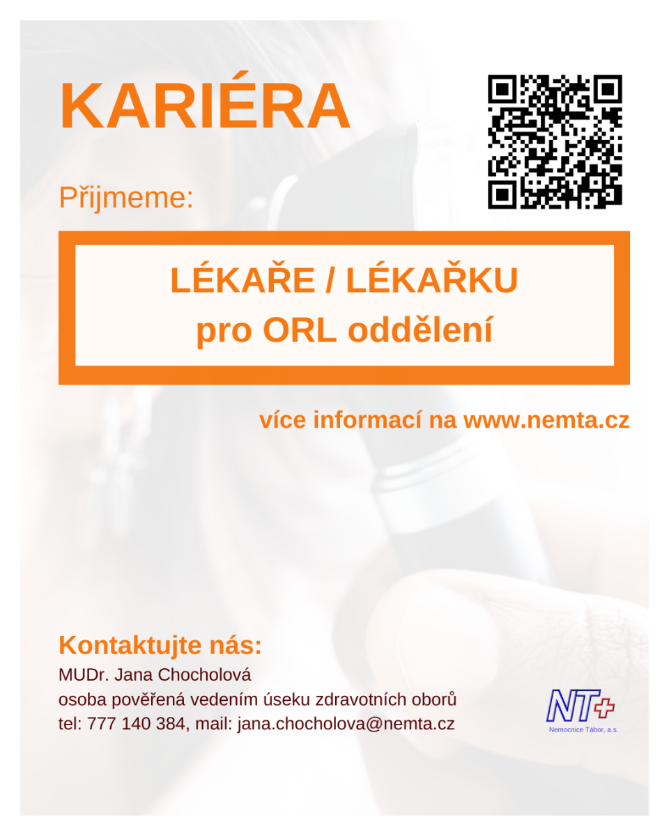 Pan primář je rodilý Pražan a absolvent 1. lékařské fakulty UK. Profesní zkušenosti získával v Nemocnici Nymburk, v Oblastní nemocnici Kolín a k nám přichází z FN Bulovka. Do jižních Čech ho přivedla nejen touha po změně prostředí a práci mimo Prahu, ale také nová profesní výzva, kterou v naší nemocnici vidí. Věříme, že jeho odborné znalosti, zkušenosti a přístup budou pro naše ORL oddělení i celou nemocnici velkým přínosem.