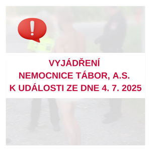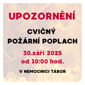 Vážení spoluobčané, dovolujeme si Vám oznámit, že ve čtvrtek dne 2. října 2014 ve 14,00 hodin proběhne v Nemocnici Tábor, a.s. v budově B – západní křídlo – druhé patro – stanice UNK a urologie za účasti Integrovaných záchranných složek cvičná evakuace. Provoz nemocnice nebude nijak omezen. Vedení Nemocnice Tábor, a.s.