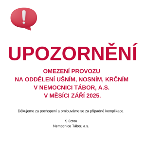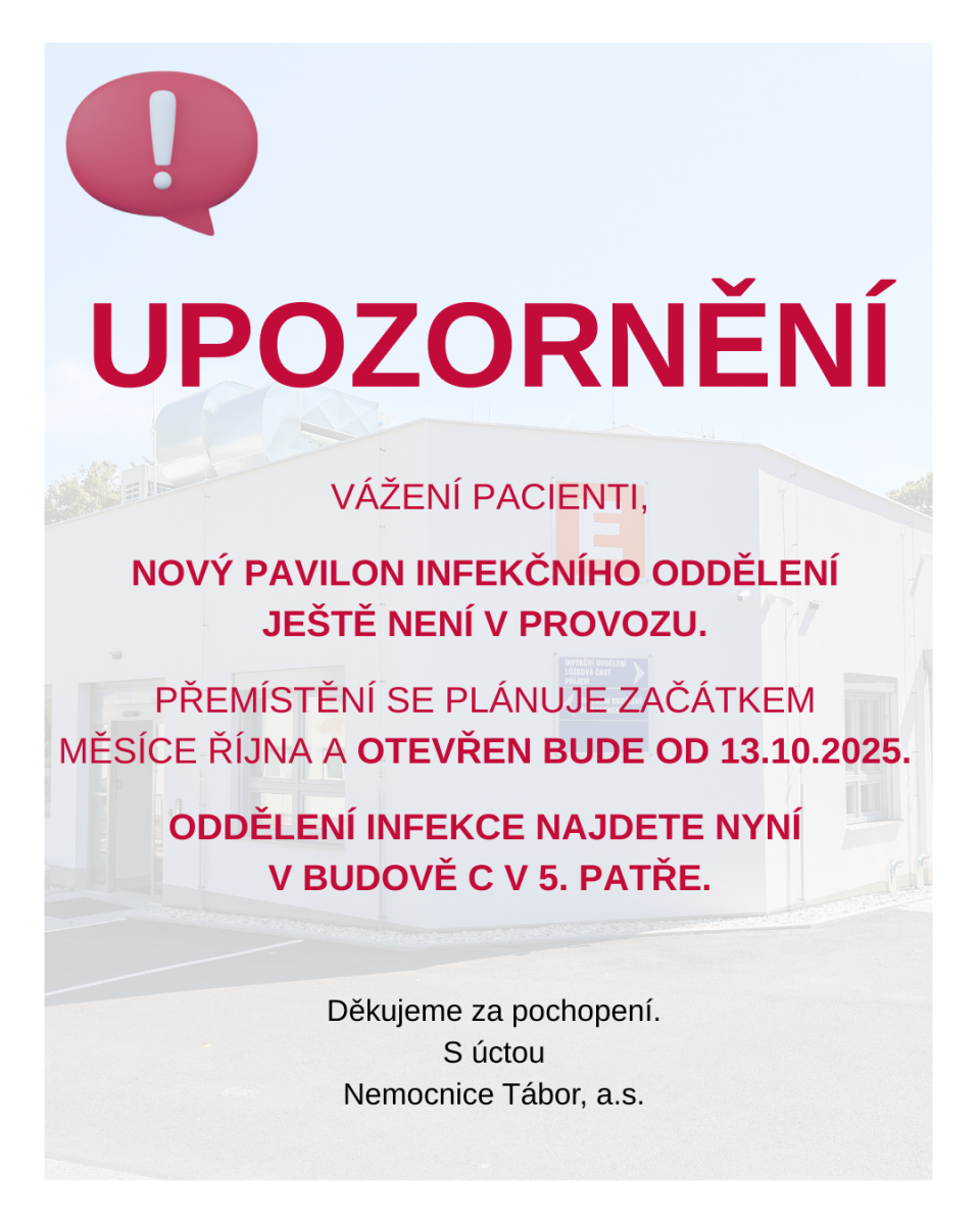 z důvodu malování a rekonstrukce bude v době od pondělí 23.3. 2015 (7:00 hod.) do 28.3.2015 (7:00 hod.) uzavřeno infekční oddělení Nemocnice Tábor, a.s.
