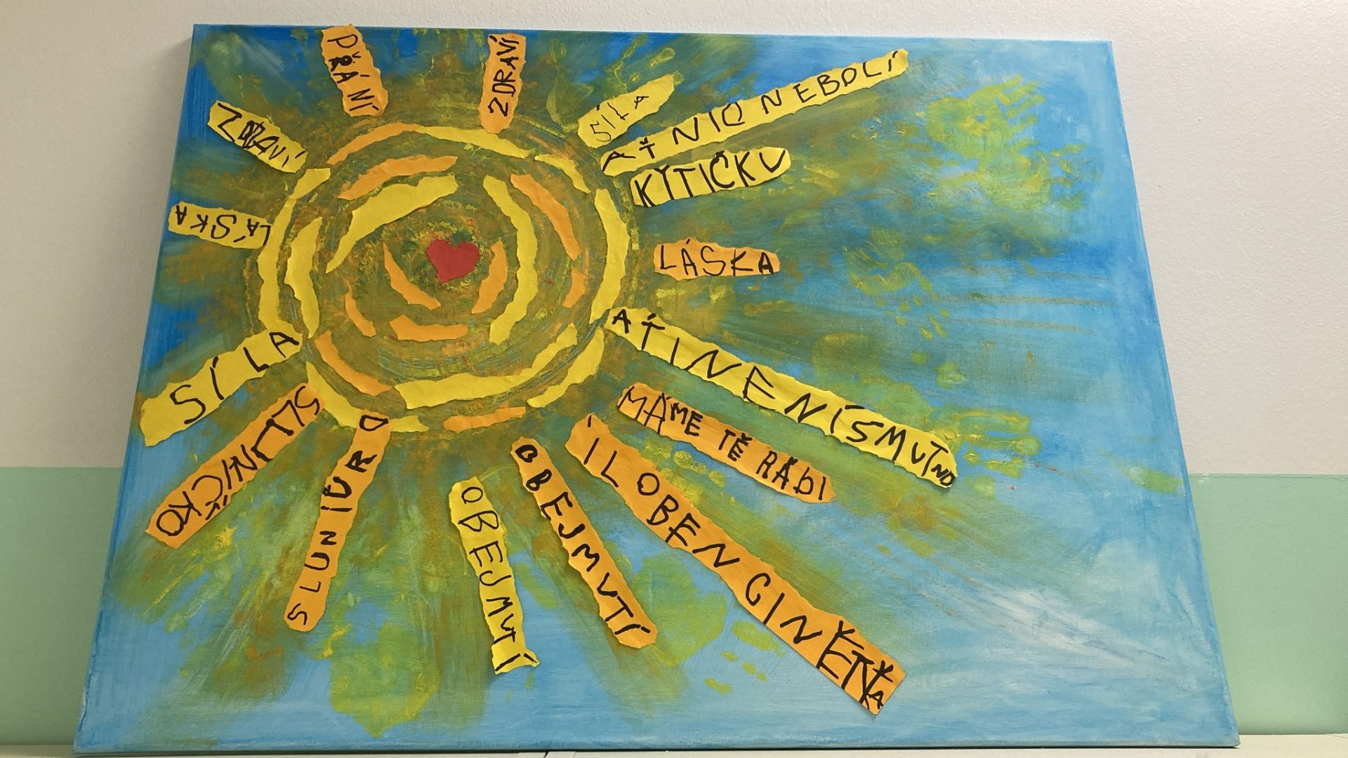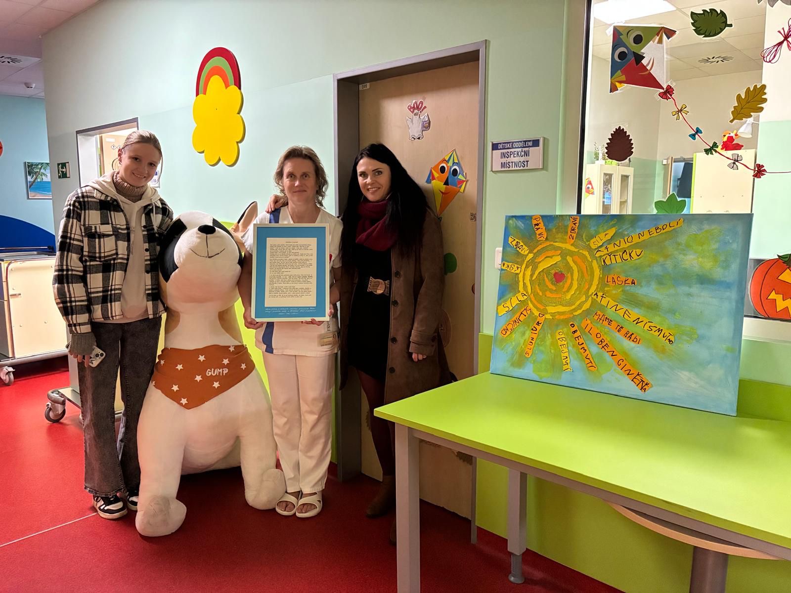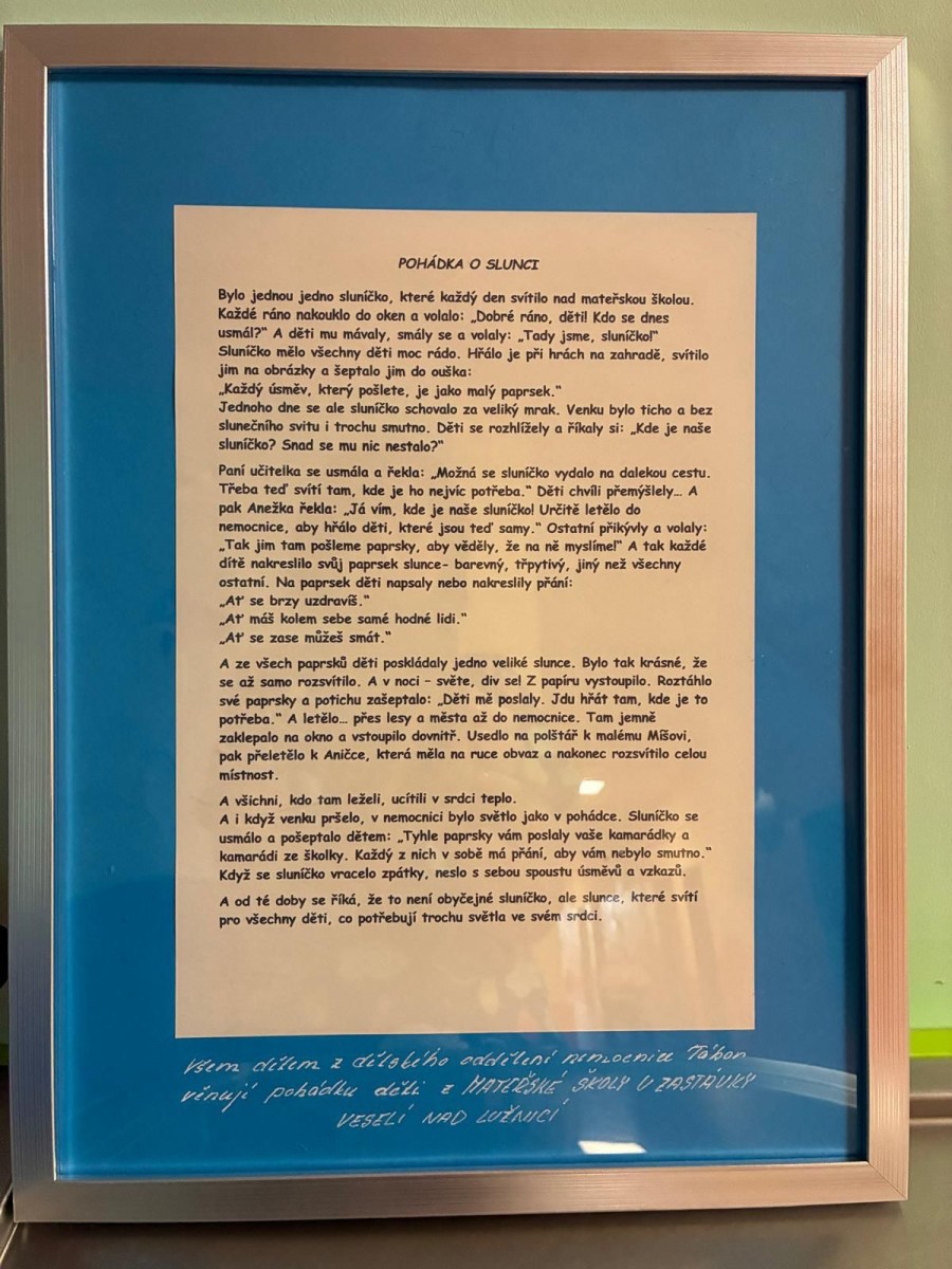 Na dětském oddělení se rozzářilo krásné slunce. Darovaly ho děti z Mateřské školy U Zastávky ve Veselí nad Lužnicí, které spolu se svými učitelkami Hanou Novákovou, zástupkyní ředitelky MŠ, a Markétou Paýrovou, vytvořily nádherný obraz plný barev, přání, síly, lásky a povzbuzení.