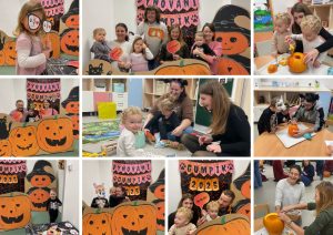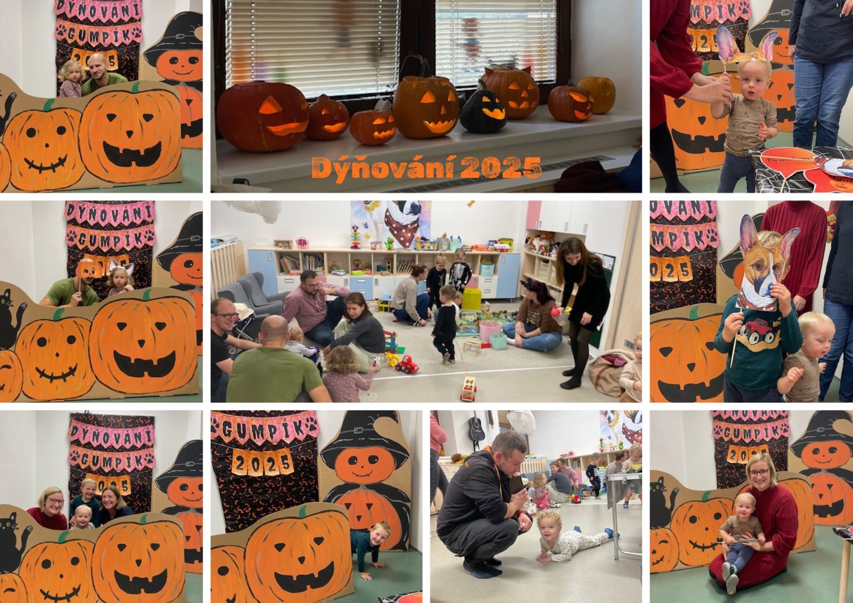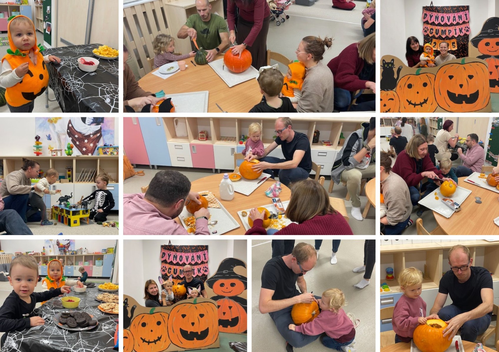 I letos si děti užily spolu s rodiči oblíbené podzimní tvoření. Naše skvělé chůvy – Alča, Evička a Janička opět připravily krásný program „Dýňování“ plný tvořivých aktivit a dlabání dýní.