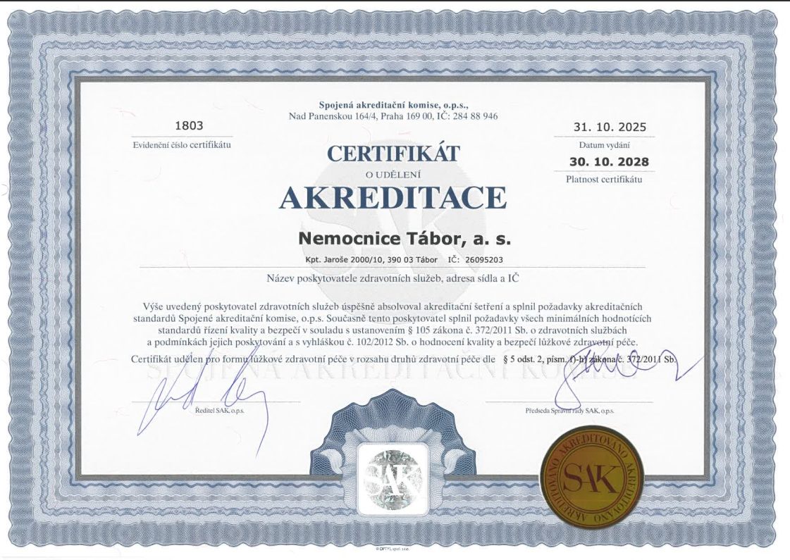 Rádi bychom se s vámi podělili o skvělou zprávu! Nemocnice Tábor, a.s., úspěšně prošla pravidelným akreditačním hodnocením, které probíhalo ve dnech 29. – 31. října 2025.