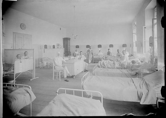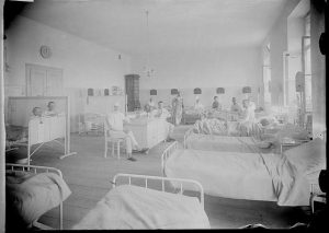 Po 1. světové válce bylo denně na 145 lůžcích hospitalizováno kolem 300 nemocných takovým způsobem, že na 2 lůžcích leželi 3 pacienti, či na 3 postelích vedle sebe 5 nemocných. Byly zde rozsáhlé pokoje – např. ženský pokoj o 28 lůžcích, většinou s 50 nemocnými, mužský pokoj s 37 lůžky a 58 nemocnými, dětský pokoj s 15 postelemi a 30 nemocnými dětmi. Jeden pacient na 1 lůžko přicházel v úvahu jen ve velmi vážném zdravotním stavu. Nemocní zde nebyli rozlišeni podle typu choroby. Tak spolu leželi vnitřně nemocní s operovanými pacienty, s případně hnisajícími ránami. Pokoje nemocných byly bez tekoucí vody, k dispozici byla jen umyvadla se studenou vodou, umývárna byla jedna na podlaží. Zpuchřelé okenní rámy znemožňovaly větrání místností. Lépe na tom nebyly ani operační sály, které byly malé bez možnosti větrání. Operační lampy měly obrovskou výhřevnost. Porody se odbývaly na pokoji mezi ostatními rodičkami. Nemocnice byla bez laboratoře, moč a stolice se vyšetřovala na lékařském pokoji, kde se i odbývala veškerá nemocniční administrativa i podávání informací o nemocných. Počty hospitalizovaných za 1 rok neustále stoupaly (v roce 1920 to bylo 2404 nemocných, v roce 1931 to bylo 2664 nemocných, atd.). Budovy byly nevyhovující jak po stránce lékařské, hospodářské, tak i administrativní.“