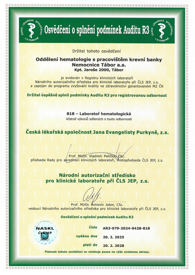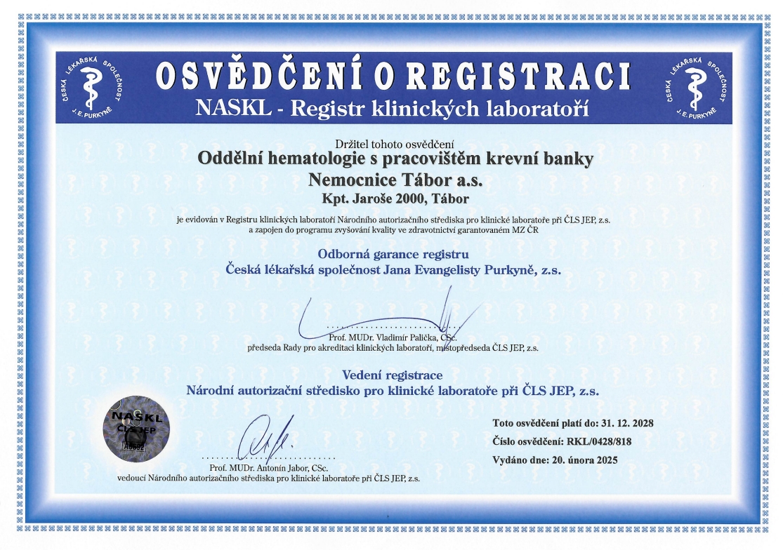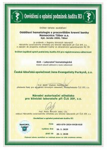 - Součástí oddělení je KREVNÍ BANKA, která zajišťuje transfúzní přípravky a předtransfúzní laboratorní vyšetření.