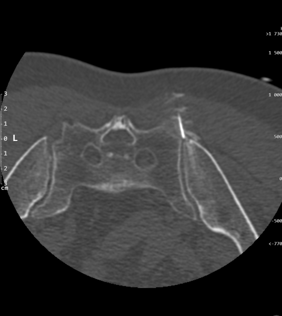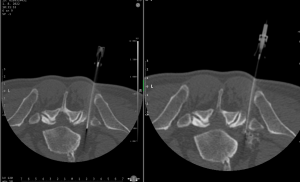 Poté je k meziobratlovému/SI kloubu zavedena velmi tenká jehla. Po přesném umístění hrotu jehly je ke kloubu aplikována směs 3,5 ml Marcainu a 1 ml Diprophosu.