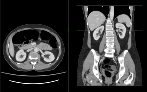 1) Nativní CT vyšetření (vyšetření bez použití kontrastní látky) – v indikovaných případech jej možno použít kdykoli. Relativní kontraindikací je těhotenství.